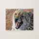 Gepardkatze, die mit den Zähnen entblößt verwirrt.