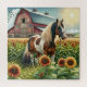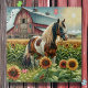 Hübsches braunes, weißes und schwarzes gepunktetes Pinto Pferd stehend vor einer alten rustikalen Scheune umgeben von Sonnenblumen, während die Sonne bei Morgengrauen aufgeht.