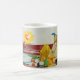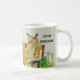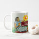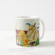 Tasse mit Malerei des Jungen und des Mädchens, die auf Bank sitzen
