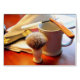Ein Vintages gerades Randrasiermesser, -bürste und -streichriemen erwähnen eine vergangene Ära -- eine große nostalgische Karte für irgendeine Gelegenheit.