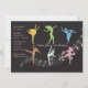 Eine drastische Einladungsaufmachung bunt, tanzend, Silhouetten gegen einen Ebenholzhintergrund mit musikalischen Anmerkungen. Vervollkommnen Sie für den Geburtstag Ihres Tanzenenthusiasten oder tanzen Sie Erwägungsgrund. Die Karte ist einfach, mit Ihrer Benennung, Schriftart, Schriftartfarbe und Wahl von sechs Papiersorten besonders anzufertigen.