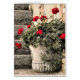 Un grand vase en pierre a été rempli de géraniums et placé sur un vol de marches extérieures.