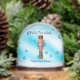 Ein traditioneller deutscher Holzfußkrecker, der einen Offizier mit einer blauen und orangefarbenen Uniform darstellt. Der Nutcracker wird auf einem blauen Hintergrund mit Schneeflocken überlagert. Der spanische Text mit dem Text "Feliz Navidad" (Frohe Weihnachten) erscheint ebenfalls. Passen Sie Ihren eigenen Text an.