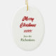 An der Vorderseite dieses Holiday-Ornaments steht das Bild eines schönen deutschen Schäferhundes. Der Hund sitzt vor einem verzierten Holiday-Baum. Auf der Rückseite steht rot und grün "MERRY CHRISTMAS", und es gibt zusätzliche Textfelder, die Sie anpassen können. Lass es sagen, was du willst!