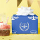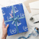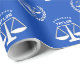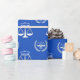 Creative Law School Absolvent Geschenkpackung mit Waagen der Gerechtigkeit auf einem blauen Hintergrund. So personalisieren Sie Text bearbeiten, um den Namen des Absolventen hinzuzufügen.