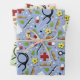 Kreative Pflegemuster mit einzigartigen medizinischen Pflegeprodukten auf blauem, grünem und rosa Hintergrund.