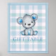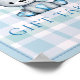 Für den Geschenktisch an Ihrer Babydusche. Niedlicher grauer Bär auf der karierten Babydecke mit genähtem Hem. Text "Geschenktabelle".