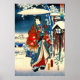 Das rechte Triptychpanel der Schneeszene, aus dem Tale Genji, ist eine Zusammenarbeit von Utagawa Hiroshige und Utagawa Toyokuni. Die links und rechten Paneele sind unterschrieben Toyokuni-ga (von Toyokuni gemalt). Hiroshige hitsu (Pinsel von Hiroshige) ist auf der mittleren Leiste. Aus einem ursprünglichen Holzschnitt aus dem 19. Jahrhundert (1857), Furyu Genji Yuki no Nagame, von Utagawa Hiroshige und Utagawa Toyokuni. Alle Rechte vorbehalten © 2013 padre art