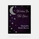 Geschrieben in den Sternen Brautparty. Silbermond und Sterne vor dunkler Mitternacht lila Hintergrund