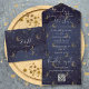 Diese einladende Hochzeitseinladung besticht durch elegante Typografie auf himmlischem Mond und Sternenhimmel. Die Einladung enthält eine perforierte RSVP-Karte mit Ihrem Hochzeitswebsite QR Code. Entwickelt von Thisisnotme©