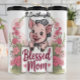 Diese skurrile Abbildung zeigt ein hübsches Schwein von Cartoon, das einen schwarz-weiß karierten Hut mit einem großen weißen Schild trägt. Das Schild ist von zarten rosa Blume und grünem Blattwerk umgeben. Der Text auf dem Schild, geschrieben in einem stilvollen Schriftart, sagt "Gesegnete Mama" in einer tiefen burgundischen Farbe, mit kleinen Herzen, die eine süße und charmante Hommage.
