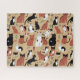 Rätsel in einer Vielzahl niedlicher, stilisierter Katzen in verschiedenen spielerischen Posen, Farben und Mustern - tabby, schwarz, weiß und calico - Set vor einem bräunlichen Hintergrund. Geschwächte Blätter und winzige Herzen verleihen dem Design einen spielerischen Akzent.