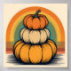 Feiern Sie spielerische Herbstschichten mit gestapelt im Herbstlicht. Drei gestapelte Kürbis erheben sich gegen einen halbkreisförmigen Retro-Regenbogen von gedämpften Herbsttönen - Rost, Senf, Oliven und aquamarin. Das subtile Beängstigen verleiht dem Stück ein altes Plakat-Charme. Ideal für Halloween- oder Herbstdekor, der jedem Raum Wärme und Lustigkeit verleiht.