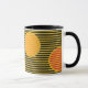 Schwarze und gelbe Streifen und orange und rote Kreise schmücken diese ins Auge fallende Tasse.