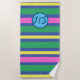 Brillante rosa, grüne, gelbe und blaue Streifen füllen dieses farbenfrohe Badetuch. Ein dunkelblaues Monogramm wird gegen einen hellblauen Kreis Set.