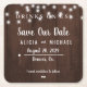 Die personalisierte Hochzeit, der Name, das Datum und der Untersetzer auf einem dunkelbraunen Scheunenholz mit Lichterkronenhintergrund werden durch das weiße Typografie-Skript, den Namen, das Datum und den Ort der lässigen Hochzeit bewahrt.