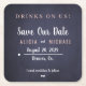 Die rustikale lässige Drinks auf uns: weiße und rot-rosa Typografie-Skript, Name, Datum und Ort personalisierte Hochzeit speichern das Datum Untersetzer auf einem dunkelblauen Hintergrund Mitternacht.