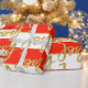 Maßgeschneidertes Weihnachts-Grußpapier. Gold Joy ist der Gruß in einem modernen Schriftart ist auf der Vorderseite dieses roten und goldenen Streifen Design.