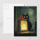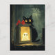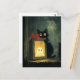 Eine lustige Halloween-Szene mit einem Geist in einer Geschenkboxen, behalten von einer schwarzen Katze in ihren Armen