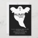 Moderne und minimalistische Halloween Einladung. Auf einem schwarzen Hintergrund befindet sich ein großer weißer Geist mit den Worten "Halloween-Party". Die Details des Party werden unten auf der Karte angezeigt. Stilvolles und dennoch lustiges Design, das für eine lustige und unvergessliche Veranstaltung ideal ist. Fügen Sie Ihre eigene Formulierung hinzu.