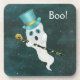Dieses Set aus harten Untersetzer aus Plastik mit Korkunterlage hat einen weißen Geist mit hellblauen Augen, die einen extravagant blauen Hut tragen und einen goldgetrimmten schwarzen Stock mit einem goldenen Schädel auf einem sterngepunkteten nächtlichen Himmelshintergrund halten. Passen Sie den Boottext mit der Vorlage an.