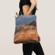 Farbenfroher und ikonischer Berg in der Nähe von Georgia O'Keeffe's Ghost Ranch in Abiquiu, New Mexico. Dunkle Sturmwolken hüllen sich über den Gipfeln, während sich die leuchtenden Sonnenstrahlen durchbrechen, um auf den in Pfirsichfarben, Gelb, Magenta und Lachs leuchtenden, bandförmigen Felsen zu glänzen.