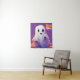 um fantasma amigável segurando uma bandeira. O fantasma é predominantemente branco com sombreamento roxo e tem olhos grandes e expressivos, além de um sorriso largo. A bandeira tem listras horizontais nas cores laranja, branca e roxa. Essa imagem é interessante por representar um fantasma de forma fofa e não ameaçadora, apesar de ser frequentemente associado a temas de Halloween ou assustadores.