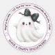 Ghoful Greetings - Ein süßer Halloween-Überraschungs-Umschlag Aufkleber Ein fröhlicher Geist mit einem strahlenden Lächeln und einem herzhaft überzogenen Bogen schweben im Zentrum eines kreisförmigen Designs, gerahmt in weichem Rosa. Umgeben von spielerischen Geisterbildern und festlichen Texten strahlt das Layout Wärme und Launen aus - perfekt, um Halloween-Mailings oder saisonalen Dekorationen eine persönliche Touch hinzuzufügen. Jedes Detail ist individuell und passt sich Ihrem einzigartigen Stil und Ihrem gepflegten Geist an.