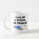 Sind Sie jemand, der gerne überdenkt oder vieles für eine lange Zeit überdenkt? Dann ist diese "Gib mir eine Minute, ich denke" Tasse für dich! Es ist auch eine großartige Geschenkidee für eine Technik, einen Codierer, einen Programmierer oder einen anderen im Bereich der Informationstechnologie.
