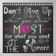 Nicht aufgeben Chalkboard Aussehen Poster mit coolem weißen Text auf einem Chalkboard-Hintergrund und einem Pop von hellrosa. Dieses motivierend und inspirierende Design lautet: "Gib nicht auf, was du am meisten für das will, was du im Moment willst"!