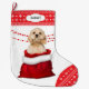 Die Vorderseite dieses Holiday Strumpfs zeigt ein Bild eines bezaubernden Stärkungszaubers Cocker Spanischer Hund, der aus einer rot-weißen Weihnachtsgeschenktüte pinkelt. Hinter dem Hund befindet sich eine rot beattelte Garage. Zehe und obere Grenze sind ein rotes und weißes Schneeflockenmuster. An der oberen Grenze befindet sich ein weißes Etikett mit dem eigenen Text in dunkelgrau. Die Rückseite des Strumpfs ist das gleiche rote und weiße Schneeflockenmuster.