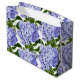 Diese Geschenktasche ist in weißer Farbe in glänzender Ausführung mit einem schönen lavenblauen Hydrangea-Blume-Druck dargestellt.