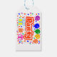 A White Gift tag, with a Drawing/Design of the Word = Party, in the color Red and White, with some Colorful Balloons, Confetti, and Gift Packages, = (Drawing/Design by P. J.M.) = on the front.