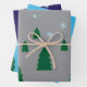 Kiefernbäume in zwei Größen (3 große, 4 kleinere im Hintergrund). Grüne Bäume haben blaue Schneeflocken, die oben in den Himmel fallen. Die Hintergrundfarbe ist dunkelgrau auf einem Blatt, hellblau auf dem zweiten und dunkelblau auf dem dritten.