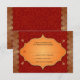 Imitate goldene Kanten machen aus dieser indischen inspirierten Hochzeitskarte einen goldenen Rahmen. Der Hintergrund ist tiefrot, mit einem subtilen Muster, das alles überdruckt, um einen verzierten Rahmen mit individuellem Antworttext zu erweitern. Der Rahmen ist von vier kleinen, goldenen Paisley-Ornamenten umgeben. Verfügbar mit passenden Produkten.