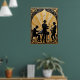 Dieses verzierte Gemälde präsentiert ein in tiefschwarz gesilbertes Jazztrio vor einer aufwändig strukturierten Goldkulisse. Eine zentrale weibliche Figur spielt eine Trompete, die zwischen drei männlichen Musikern positioniert ist, einer mit Trompete und der andere mit Saxophon. Hinter ihnen ist ein Hinweis auf ein Drum-Kit zu sehen. Der goldene Hintergrund ist reich an wirbelnden, geprägten Mustern und einem prominenten, stilisierten Mond und schafft eine Vintage Jazzästhetik, die an den Jugendstil oder frühe Art Déco-Epochen erinnert.