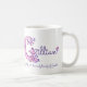 Verzierter Hand gezeichneter Buchstabe mit Ihrem eigenen Namensanfang mit G und der Namensbedeutungs-Tasse. Hübsche Herz- und Blumen-Hauptstadt G kritzelte den typografischen Entwurf, der Herzen und Blumen kennzeichnen und die Wörter Youthful Gillian. Eine himmlische Schönheit von Jupiter in rosa und in Lila. © einzigartige Kunst und Entwurf durch Sarah Trett. www.sarahtrett.com für www.mylittleeden.com auf zazzle