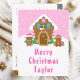 Diese lustige und festliche Urlaubskarte kann mit einem Namen oder Titel, wie Tochter, Enkelin, Nichte, Freund etc. personalisiert werden. Es verfügt über ein niedliches Lebkuchenhaus, das mit rosa und grünen Süßigkeiten dekoriert ist. Daneben sind bezaubernde Lebkuchenmänner mit Geschenken, in Weihnachtsmannmützen und Schal gekleidet. Im Hintergrund ist ein hellrosa Winterhimmel mit eleganten fallenden Schneeflocken. Der Text verbindet dekorative und serifenlose Schriftart für einen stilvollen und modernen Look. Dies ist ideal für ein Weihnachtsgebäck mit Party.