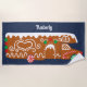 Dieses personalisierte Badetuch ist ein ideales Weihnachtsgeschenk für RV-Besitzer. Es zeigt eine Abbildung eines Lebkuchenbrotes RV. Dieser festliche Kekscamper ist mit weißem Eis, roter und grüner Süßigkeit und Set vor marineblauem Hintergrund dekoriert. Das Handtuch ist bereit, oben mit einem Namen oder einem anderen benutzerdefinierten Text personalisiert zu werden.