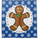 Lebkuchen-Mann-Keks auf einem blauen weißen Schneeflocken Muster Hintergrund.