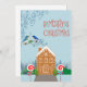 Helle und fröhliche Weihnachtskarte mit Lebkuchenhaus und Vögeln