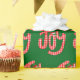 Niedlicher Schneemann auf rot-weiß Gingham JOY Spaß Schriftart Stil auf grünem Hintergrund. Die Hintergrundfarbe kann geändert werden.