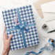 Klassisches blaues Gingham-Karomustergeschenk-Verpackungspapier. Hohe Qualität druckte Matt-, glattes, Leinen oder Tyvek Papiergeschenkverpackungspapier. Kariertes Muster des klassischen Ginghams. Gemacht und in den USA gedruckt. Ideal für Geburtstag, Jahrestags- und Hochzeitsgeschenke oder Weihnachtsgeschenke.