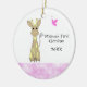 A whimsical giraffe with a sweet face. A border of fluffy pink cotton along the bottom and a bright butterfly above.