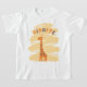 This design features a cartoon-style illustration of a giraffe in bright orange with classic brown spots across its body. Its long, slender neck and small head are topped with two cute antenna-like ossicones, giving it a friendly and adorable look. Above the giraffe is the word “GIRAFFE” in bold, all-caps lettering in orange and brown tones—strong yet playful. The background includes soft, irregular yellow brushstrokes that add a cheerful and dynamic touch.