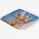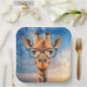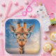 Eine Giraffe trägt eine stilvolle, schwarz gerippte Brille vor einem Himmelshintergrund, was ihr einen ausdrucksvollen und skurrilen Look verleiht.