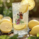 Portrait einer niedlichen Giraffe vor einem gelben Hintergrund mit rosa Blume.
