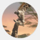 Eine Giraffe für Erwachsene grüßt ein Baby-Giraffe vor dem Hintergrund eines afrikanischen Sonnenuntergangs.