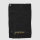 Einfache Girly Clean Minimalistisch Black und Gold Monogram Name Signature Script Custom Personalisiert Golf Handtuch. Dieses Design mit Ihrem Vornamen in einem hübschen handgeschriebenen Stil Swash Schwanz Schriftart Signatur Typografie (oder Kalligrafie) auf schwarz und goldfarben Hintergrund. Diese sind einfach zu anpassen. Große stilvolle feminine Geburtstagsgeschenke, auch für den Muttertag, Hochzeit, Jubiläum, Junggeselinnen-Abschied, Brautparty und Es ist für das Mädchen, das Lieben einzigartige, saubere minimalistische Dinge.