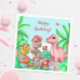 Fun und farbenfrohe Dinosaurier Geburtstagsnapkins mit fröhlichen rosa, orangefarbenen und braunen Dinosauriern, umgeben von tropischen Blätter und Blume. Eine spielerische Touch für die prähistorische Feier eines Mädchens - ideal, um dem Party eine Persönlichkeit hinzuzufügen und sich dabei mit dem Party eines Dinosauriers abzustimmen.
